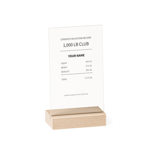 1,000 LB Club Acrylic Plaque with Wooden Stand — 3-Lift Weightlifting Plaque